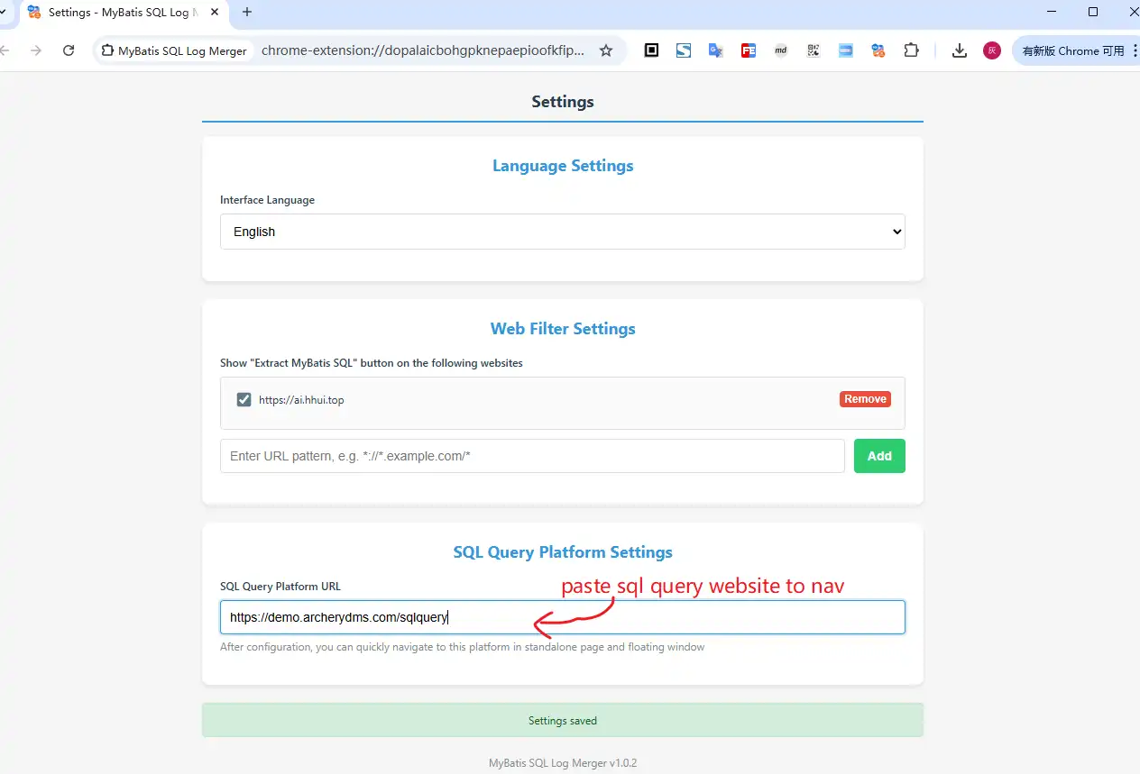 MyBatis SQL Log Merger offers a convenient way to extract SQL directly from any webpage by injecting a button into the page. Here's how to activate this feature: